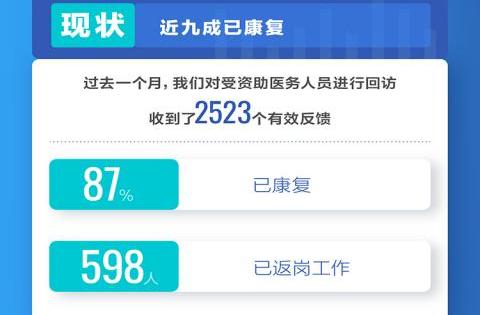 随着疫情逐步得到控制,2月28日后,每日新增确诊感染的医务人员数量已经进入个位数阶段。过去一个月,字节跳动医务救助基金志愿者对受资助医务人员进行回访,共收到2523个有效反馈,其中87%的医务人员已经康复,有598人已经重返工作岗位。