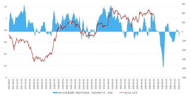 理论上,汇率是不可预测的,不过我们可以从外汇市场成交的各项价格中捕捉投资者的预期。不同的价格在不同的阶段会有相对准确的预测性。我们发现,中美爆发贸易战后,1年期NDF市场蕴含的市场信息,可以相对准确的预测半年后人民币汇率的走势。NDF的价格主要包含两部分,一部分是利差,另一部分是投机者的汇率预期。要准确的捕捉人民币汇率预期,需要先剔除NDF中利差的影响。考虑到NDF市场的交易主体主要是境外银行、对冲基金等海外机构,其利差构成与CNH的DF利差构成基本一致。我们的测算表明,CNH的DF完全符合利率平价,其波动主要由CNH市场利差决定,所以我们可以用1年期NDF减去1年期DF反映投机者的汇率预期。在下图中,我们发现当NDF-DF大幅上升时,代表人民币汇率有较强的贬值压力,当NDF-DF较为平坦时,人民币汇率倾向于升值,这种升值或贬值压力一般会在半年之后兑现。2020年3月至今,NDF与DF之差已经由正转负,二者基差最高达到-400,预示下一阶段人民币汇率还会有较强的升值空间。