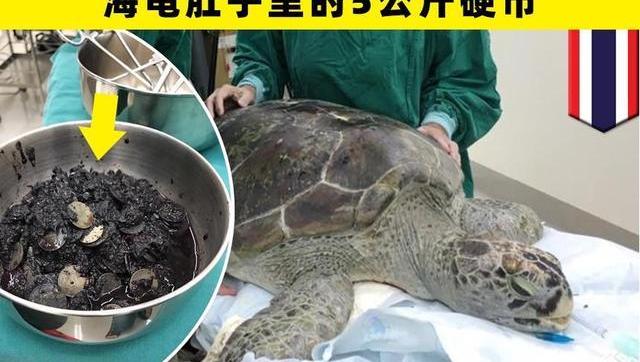 2017年3月,泰国曼谷的外科医生花了4个小时试图挽救一只海龟的生命,并从它的胃里取出915枚硬币,它们大约重5公斤。这只绿海龟被称为“Omsin”或“存钱罐”,经常有游客来拜访它,游客们会向它扔硬币以祈求好运和长寿。尽管游客们的本意是好的,但这些硬币最终还是导致其死亡。