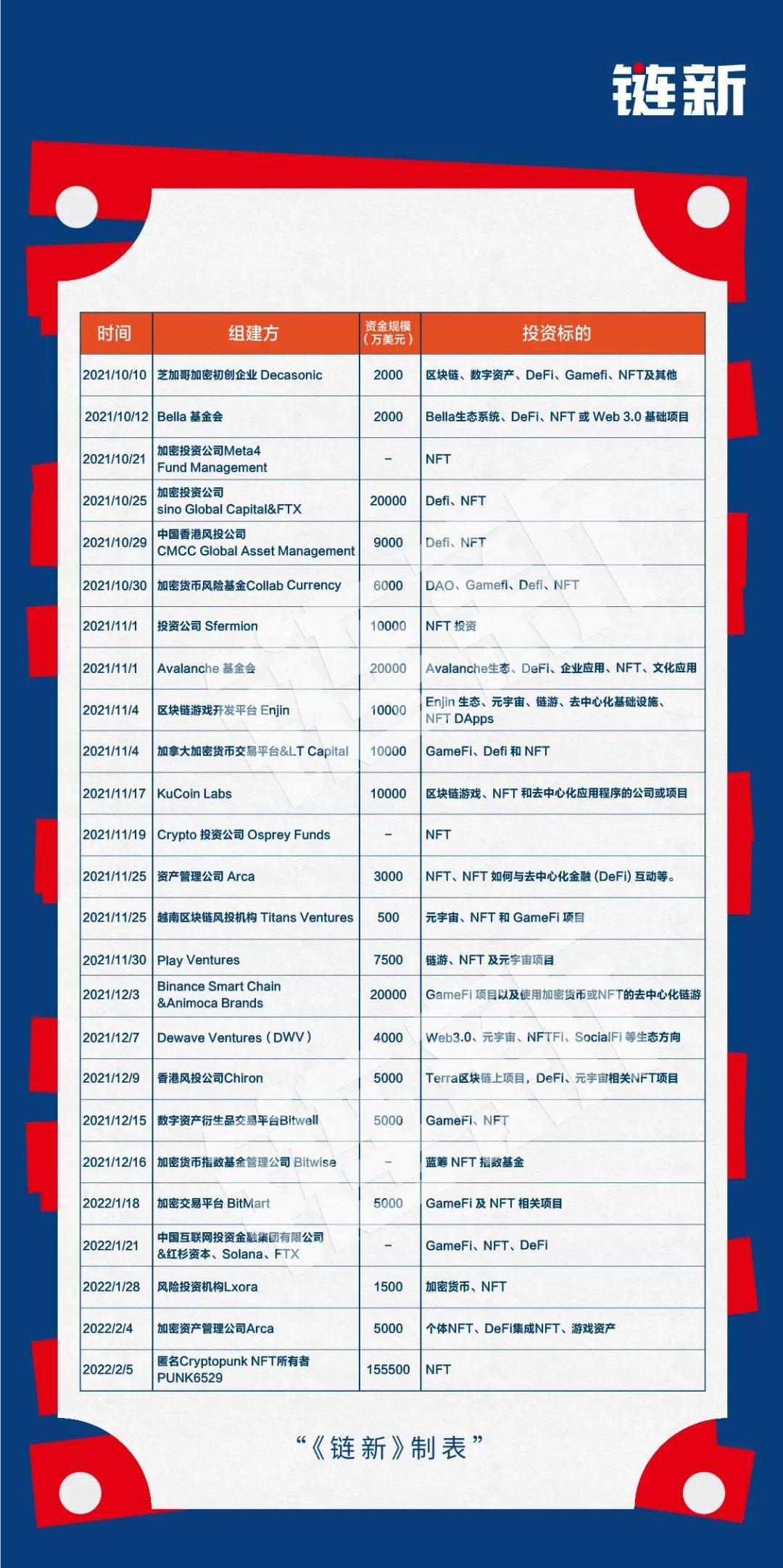 据《链新》统计,2021年数次“NFT破圈”的消息激发了VC对NFT市场的投资热情,导致针对NFT领域的基金组建数量和体量逐步走高。