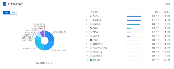 除此之外,该版块还添加了实时/预估矿池排名。实时矿池排名是对各大矿池的实时算力进行监控并排名,预估矿池排名则是以实际出块量为标准。