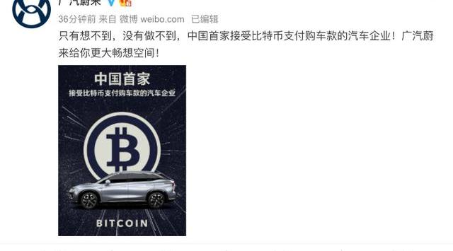 12月31日,广汽蔚来通过其官方微博宣布接受比特币支付购车款。广汽蔚来也成为中国首家接受比特币支付购车款的汽车企业。