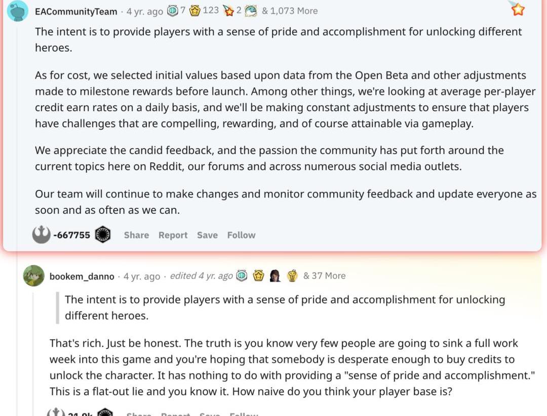 2017年,EA公司发布了《星球大战前线2》(StarWarsBattleFront2),玩家要么必须玩40个小时才能解锁一个角色(比如DarkVader),要么就得付费。该公司对此的回应堪称是Reddit历史上最不受待见的评论,突显出游戏发行商和玩家之间的敌意,如下图所示。该公司大约30%的总体收入完全来自其足球游戏FIFAUltimateTeam(FUT)战利品盒式的道具销售,泄露的公司文件显示,该公司的首要任务是捕获微交易活动:EA声称“所有道路都通向FUT”,因为“FUT是基石,我们将尽一切努力将玩家吸引到那里。”