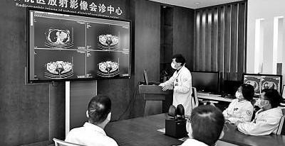 浙江余杭区医生通过远程调取检查影像进行会诊。新华社发