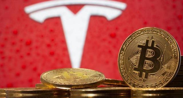 照片为比特币及特斯拉商标。特斯拉本来在今年三月时宣布将接受买家以比特币付款,但在本月13号却因环保因素而决定取消这项计划。