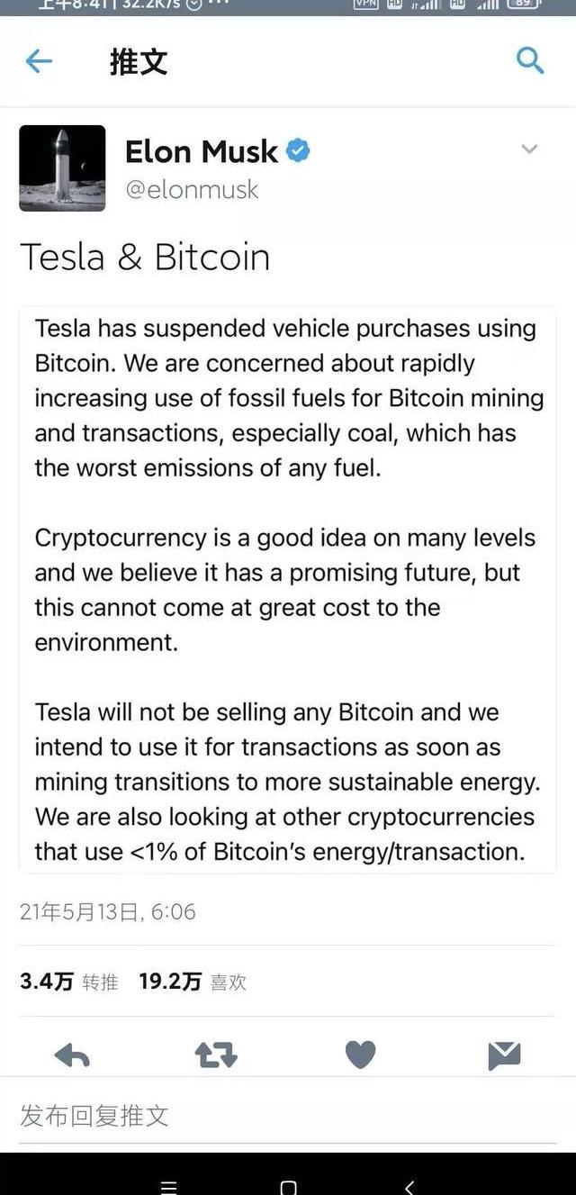 特斯拉将不会出售任何比特币,我们打算在矿业向更可持续的能源过渡时使用比特币进行交易。我们也在研究其他使用比特币能量/交易的加密货币。