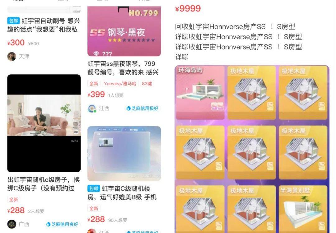 罗毅告诉《链新》:“虹宇宙不提供玩家之间资源买卖渠道,不管是房产,还是电视、钢琴,都只能通过’赠予‘形式流通,”正因如此,有氪金需要的玩家便就转战其他线上买卖平台,闲鱼这样的平台,因其本身的二手商品专卖性质,很快就成了“虹宇宙资源集散地”。