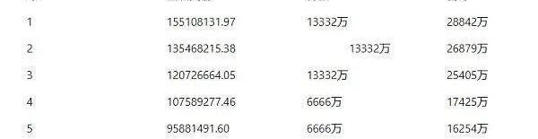 随区块逐步递减6年减半的函数模型,计算得出首年区块奖励为15510万枚,前6年的区块奖励详见下表所示。