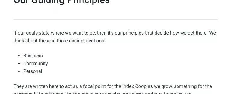 这些成分发挥作用的最好例子之一是IndexCoop,这是一家去中心化的资产管理公司,负责创建和维护加密指数产品。Index有一本社区手册,概述了合作社业务、合作社社区和参与合作社的人员的原则。