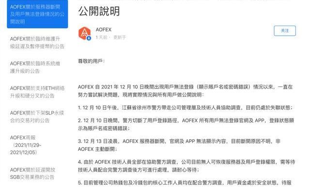 随后,12月11日,A网在公告中提到公司技术部门工作人员正在配合机关调查,于12月11日起暂停用户提币。12月13日,A网再度就服务器断开和用户无法登录情况进行了公开说明,12月10日午后,江苏省徐州市带走公司管理层及技术人员协助调查,目前仍处于失联状态,同日晚间,切断了用户登录路径,A网所有用户无法登录官网及App,登录状态显示为账户名或密码错误。