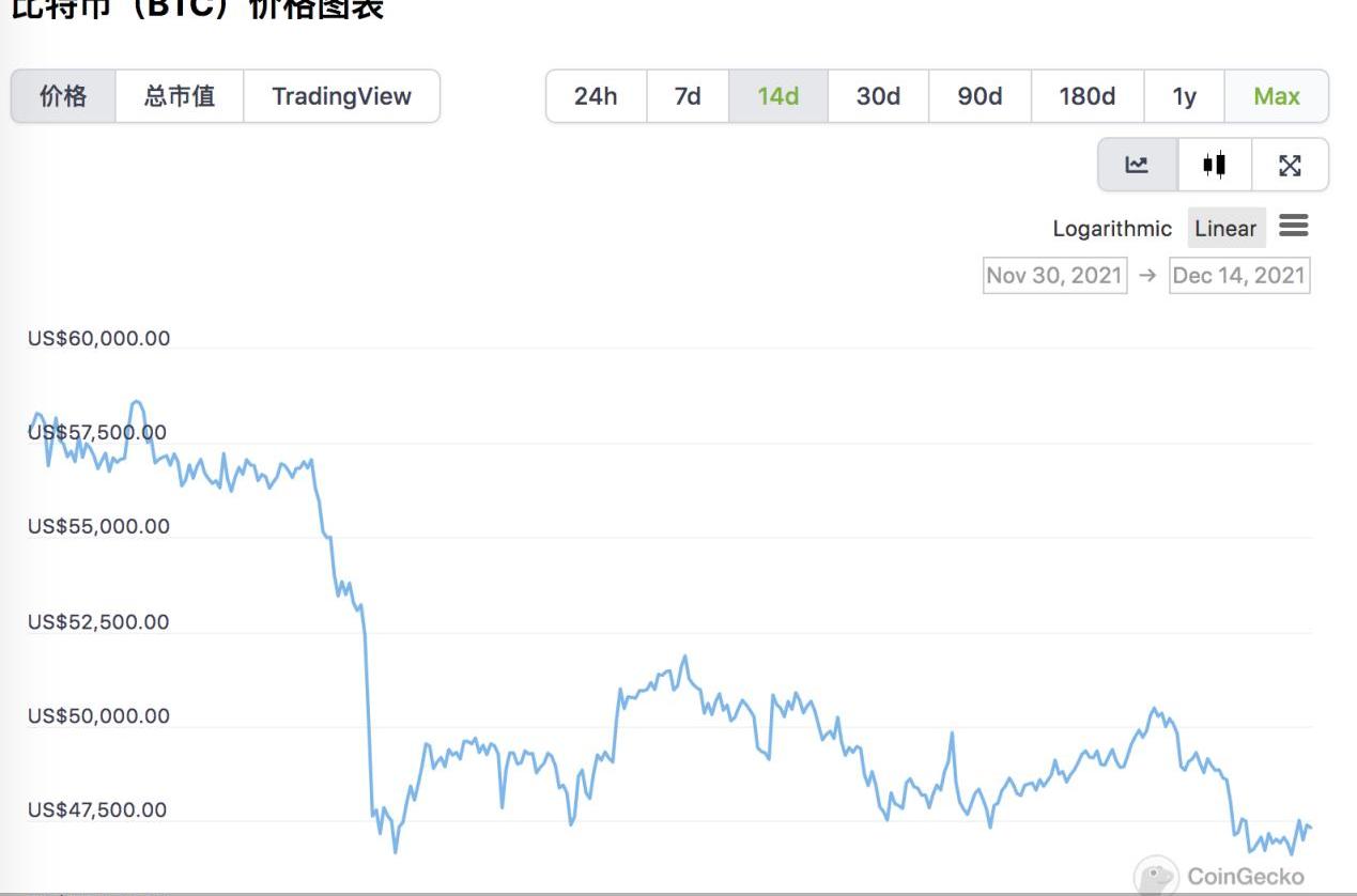 全球币价网站CoinGecko数据显示,截至12月14日19时55分,比特币报47336美元,12月以来下跌18.2%;以太坊报3812美元,12月以来跌幅为14.2%。