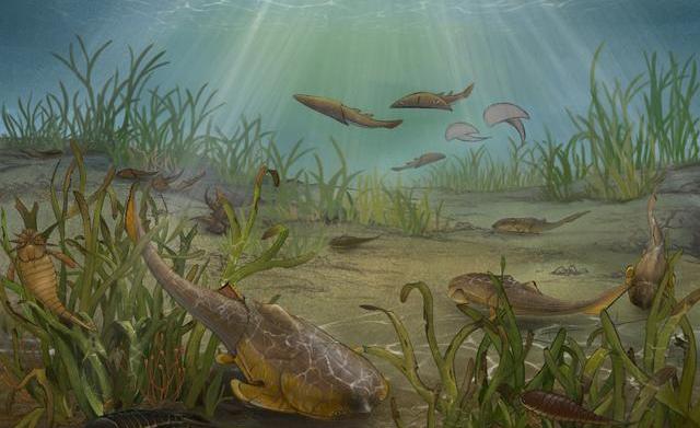 重庆秀山罗德洛世动物群生态复原图。郑秋旸绘,中科院古脊椎动物与古人类研究所供图