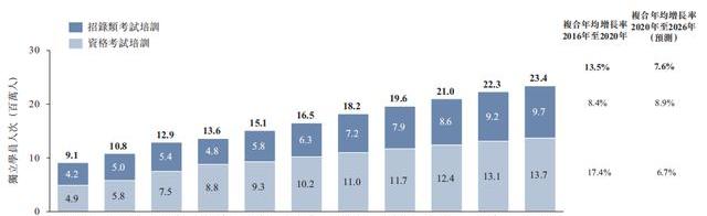 来源:招股书此外,根据弗若斯特沙利文报告,中国职业考试培训行业的独立学员人次从2016年的9.1百万名增至2020年的15.1百万名,复合年均增长率为13.5%,预期截至2026年会达到23.4百万名,自2020年至2026年的复合年均增长率为7.6%。