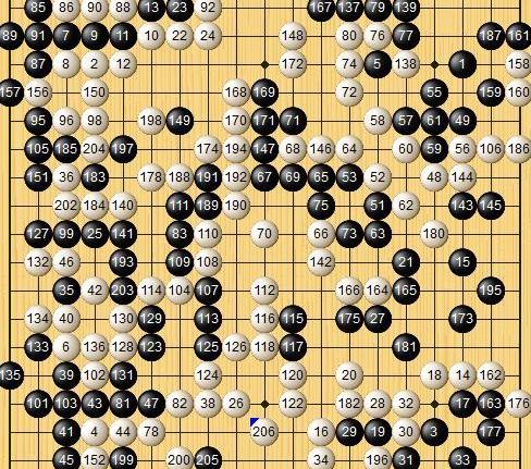 黑棋,还在顽强坚持。黑203,只能在连回黑197和吃住白棋两个尖兵之间做出选择。看来,金明训八段已经发狠。申真谞九段,这次也能逃出劫数吗?