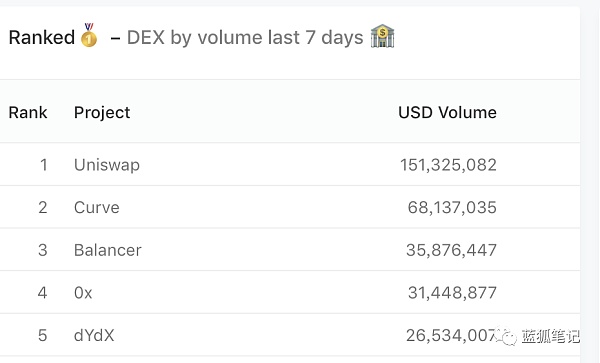 当我们提到DEX赛道,Curve是绕不过去的项目。它锁定的资产量达到7300多万美元,当前(截止到蓝狐笔记写稿时)在DEX类别中排名第二,仅次于Balancer,超过Bancor。如下图: