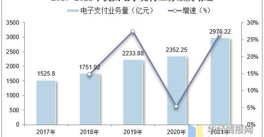 近年来我国电子支付业务规模一直保持增长态势,据统计,截至2021年我国电子支付业务量金额达2976.22亿元,同比增长9.75%。