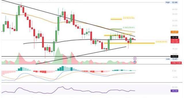 几天前,ETC在22.3美元附近的200天均线阻力位被看跌拒绝。ETC目前仍在20美元左右的0.382斐波那契水平找到支撑。然而,由于ETC昨天已经在20.3美元附近的50天均线阻力处被看跌拒绝,现在可能会看跌地跌破0.382斐波拉契支撑位。