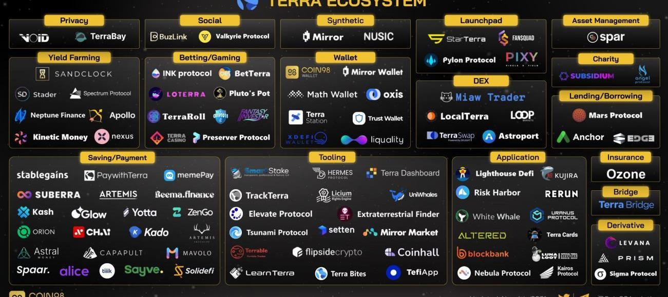 随着今年加密市场新兴公链的不断崛起,Terra也在今年7月份推出1.5亿美金的生态基金,用于扶植Terra生态内的应用。在不到一年的时间里,Terra生态从Anchor、Mirror等少数几个项目发展到近200个项目。
