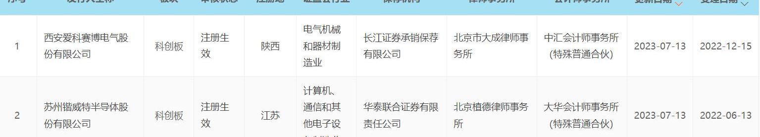 2家科创板拟上市公司发审状态更新锴威特、爱科赛博注册生效