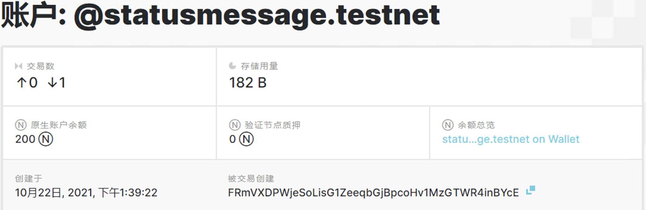 同时,我们可以给statusmessage.testnet创建一个子账户,名为contract01.statusmessage.testnet,用于合约的部署