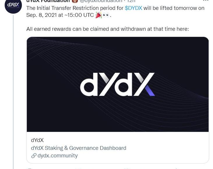 巴比特讯,9月7日,去中心化永续合约交易平台dYdX发推宣布将于北京时间9月8日23:00解除治理代币DYDX转账限制,用户可以认领和转移获得的奖励,包括空投奖励。dYdX表示,DYDX授予代币持有者对协议变更提出建议和投票的权利以及交易费用折扣,另外,dYdX无疑创造财务回报,因此基金会不会寻求在任何CEX或DEX上线。