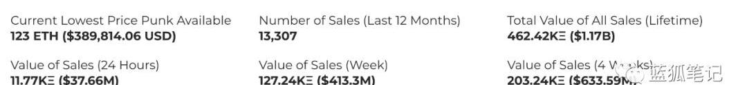 按照蓝狐笔记写稿时,Cryptopunks地板价为123ETH,相当于38.9万美元。