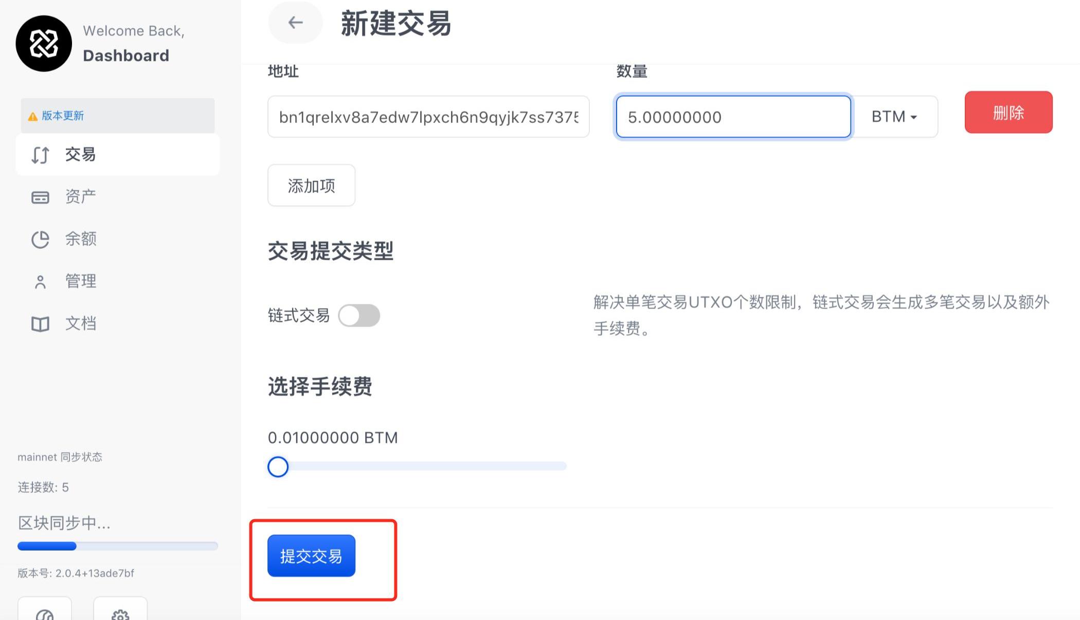 ①填写转账信息,资产别名,填写BTM,地址和数量根据您的需求填写,填写无误后点击提交交易,记住预留足够的手续费,一般0.1即可