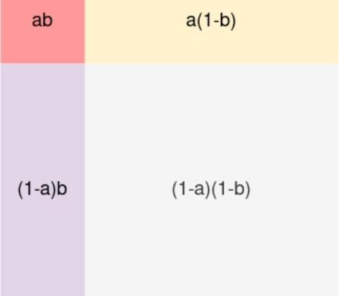 我们首先描述两个不可能发生的事件的情况,将这两件事命名为a和b。用1-a来指代a没有发生的情况,同理,用1-b来命名b没有发生的情况。注意,你应该考虑a和b都发生的情况,和a与b都不发生的情况。我们考虑“结果窗口”,于是就分为四个象限:ab,a(1-b),(1-b)a,(1-a)(1-b),这些象限加起来是1。