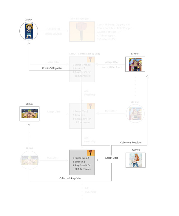 现在你明白了吧。创作者铸造一个 LexART 通证,使用该通证提供一个报价,并以同样的通证收取版税。买方接受报价并成为一个收藏者,并与创作者一起收取版税。
