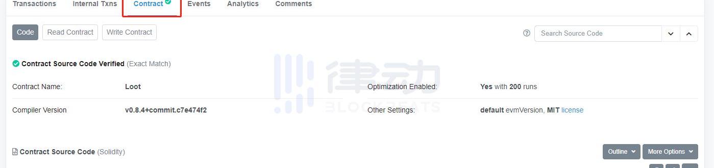 以Loot为例,我们找到Loot的官方的合约地址为0xff9c1b15b16263c61d017ee9f65c50e4ae0113d7