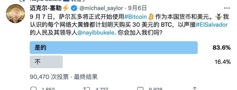 在萨尔瓦多宣布为Chivo钱包置入30美元的BTC用以鼓励民众使用时,9月6日,美国股上市公司MicroStrategy的CEO、比特币巨鲸迈克尔·塞勒在网上发起了一个活动,号召加密资产爱好者都在7日当日购买30美元的BTC,以声援全球首个采用比特币的主权国家。他为活动发起了意愿投票,共吸引了90470次投票,83.6%的网友表示会加入行动。