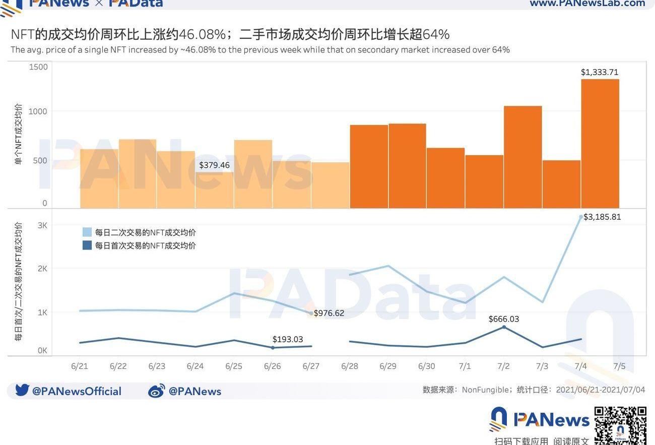 上周,NFT的成交均价约为829.08美元,周环比上升约46.08%。一手市场成交均价约为335.77美元,周环比上涨约15.92%;二手市场成交均价约为1834.36美元,周环比上涨约64.01%,涨幅明显。其中,7月4日,二手市场上的成交均价约为3185.81美元,创下自五月中旬以来的单日最高成交均价。