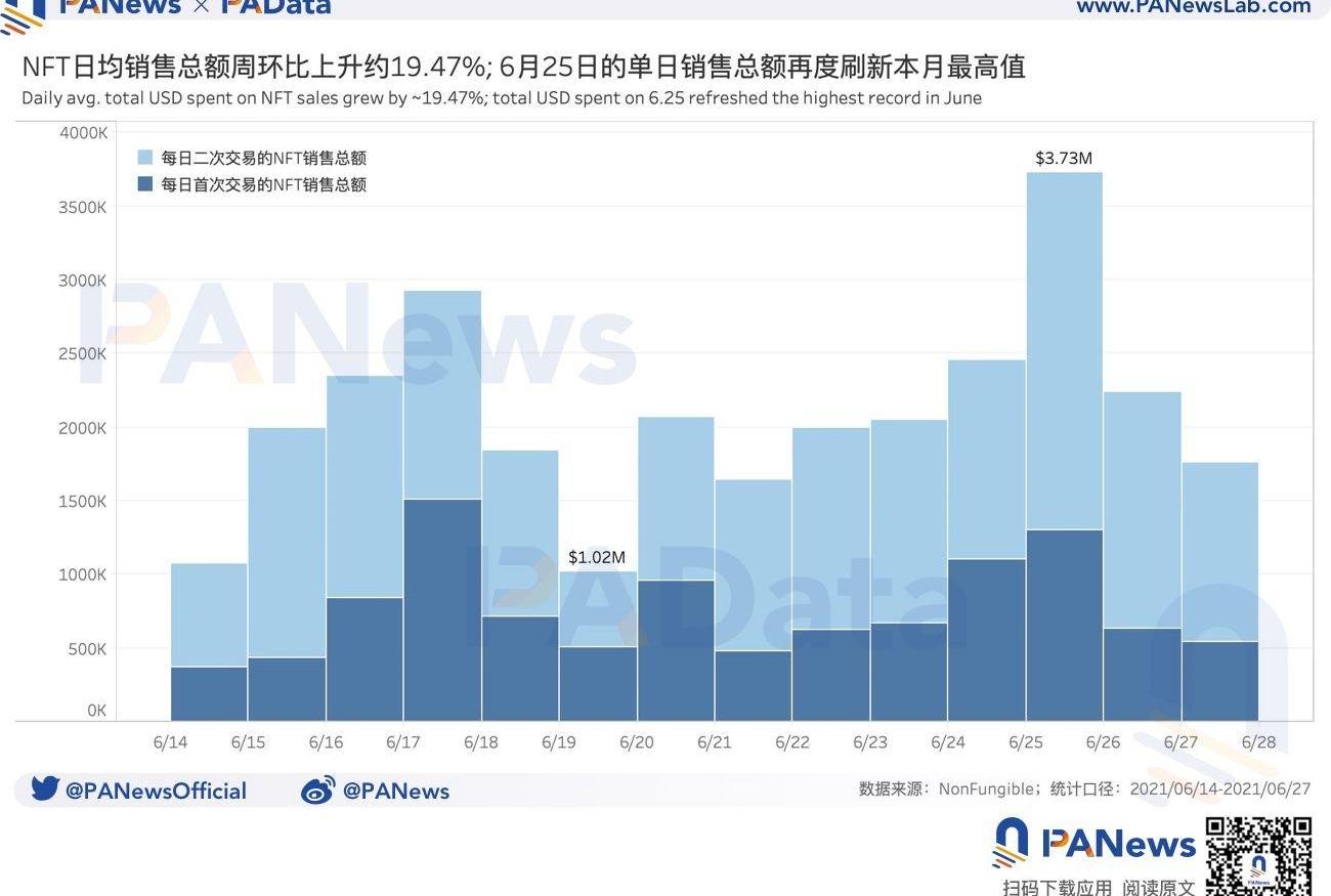 上周,NFT销售总额持续上升。日均销售总额约为226.82万美元,周环比增长约19.47%。6月25日,单日销售总额约为373.50万美元,再度刷新本月最高值。