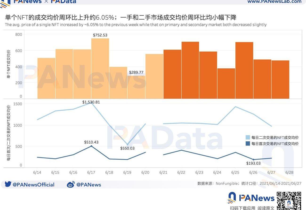 上周,NFT的成交均价约为567.55美元,周环比上升约6.05%,已为连续两周上升。