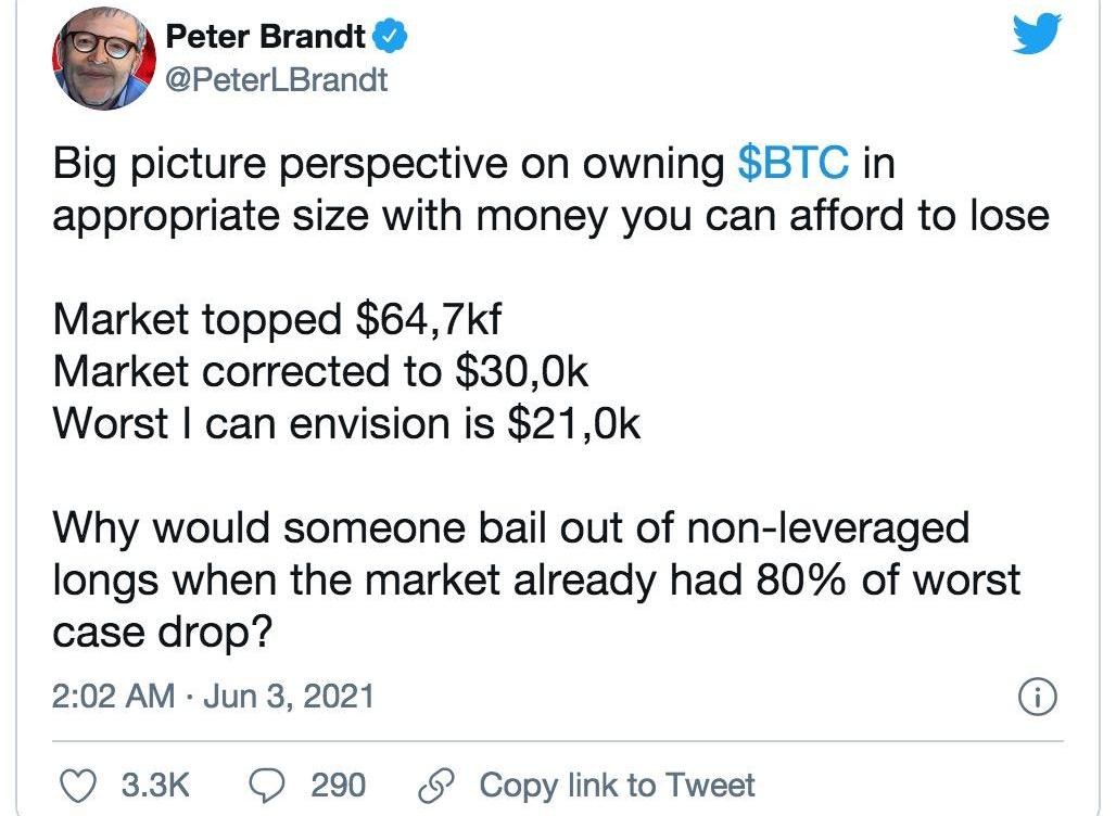 资深交易员PeterBrandt预测,在目前情况下,BTC/USD的最终下限将是21,000美元。