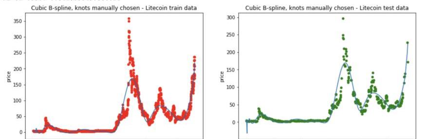 三次B-样条是三次样条的一个更容易的变体,用于高效计算,因为最多有5个基函数参与贡献插值。下面我们可以看到三次B-样条在Litecoin价格上的表现,将结点放在四分位数上之后。