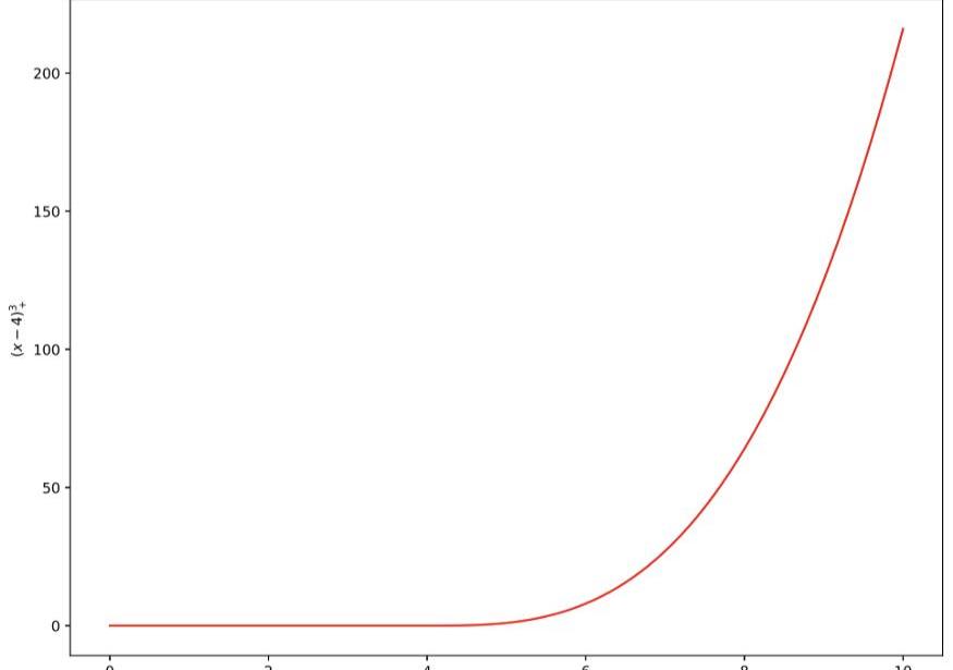 样条的一个例子是下面的截断线性函数。它在4的左边是平的,称为函数的结。