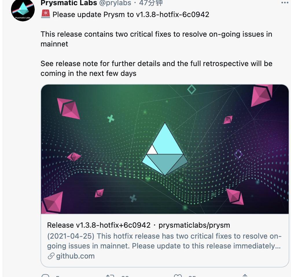 4月25日,以太坊2.0客户端执行团队PrysmaticLabs在推特上表示,请将Prysm更新到v1.3.8-hotfix-6c0942版本。该版本包含两个关键的修复,以解决主网中正在出现的问题。
