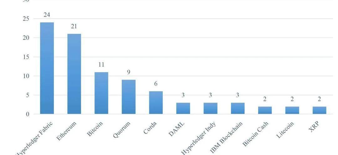 从所用平台来看,上榜的50家机构主要使用的平台共49种,其中11种平台被超过1家上榜机构使用,HyperledgerFabric、Ethereum、Bitcoin是使用最广泛的三种平台。