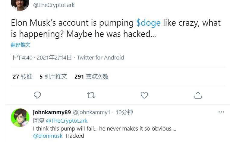 值得注意的是,马斯克虽然会在推特上偶尔提及狗狗币,但从未如今天这般密集和直接。陆续有多个海外网友怀疑马斯克的推特账号被黑了。