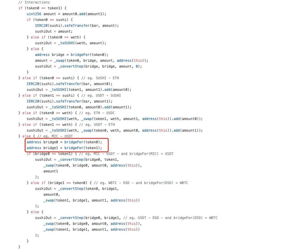 2020年11月30日,SushiSwap就曾因为SushiMaker的问题出现过一次攻击(详解参阅:以小博大,简析SushiSwap攻击事件始末),本次攻击和第一次攻击相似,但流程上有区别。相较于旧合约,在新的合约中,手续费在兑换的过程中会通过bridgeFor函数为不同交易对中的代币寻找特定的兑换路由,然后进行兑换。