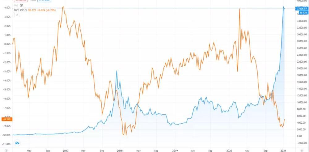在下图中,蓝色的为BTC价格,橙色的为DXY价值的相对变化。在2017年底和2021年初的两个历史高点,你可以看到随着DXY的价值下降,BTC的价格均在上升。当然,这里还有很多其他因素在起作用,但这是其中一个有趣的因素。?