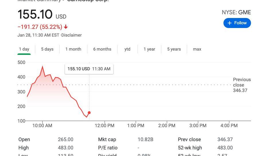 不过开盘之后,前期散户抱团逼空股的疯狂态势,有所暂停。虽然周四当日游戏驿站GME盘中创出历史新高近500美元,但随后大幅滑坡。AMC,Express,黑莓股价均腰斩或接近腰斩。