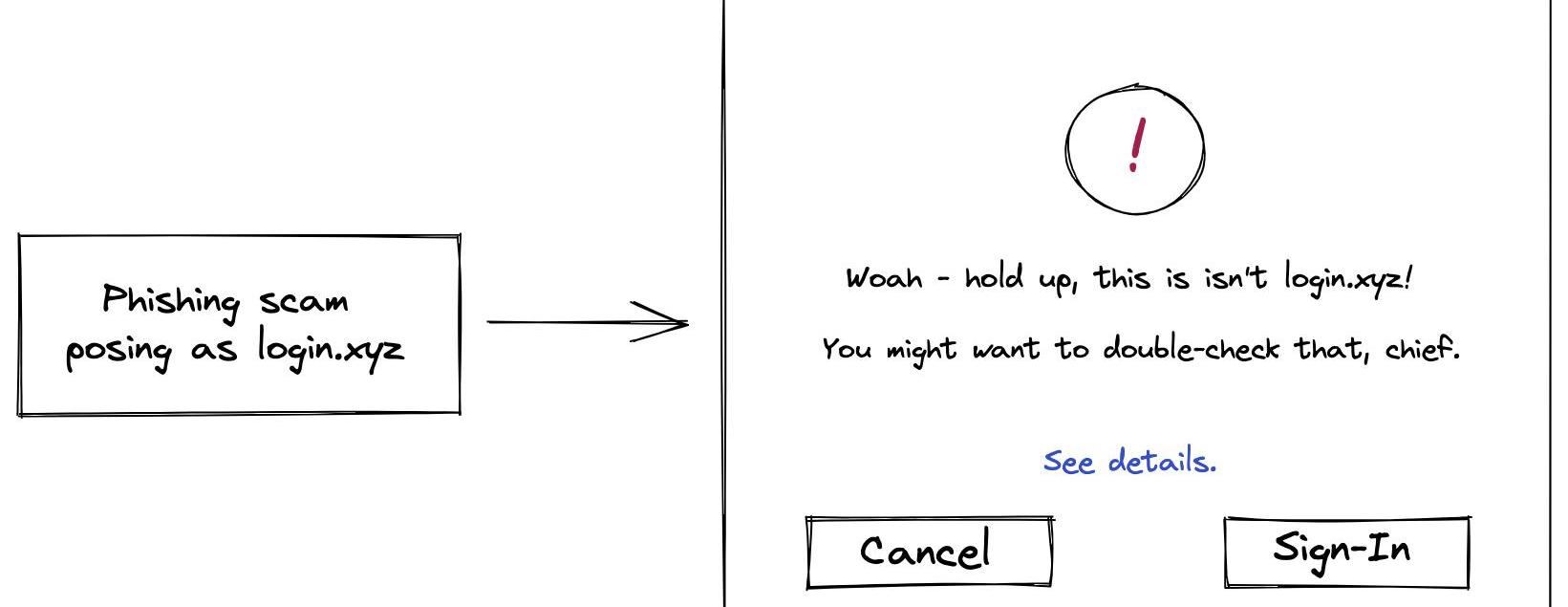 该规范还为钱包引入了额外的安全要求,例如防止网络钓鱼攻击的域绑定和防止重放攻击的随机数,在整个体验过程中进一步保护用户。例如,如果钱包找到有效的SIWE消息,但用户正在为example.com签名,但实际上是在exampie.com上,则钱包可以警告用户以下情况: