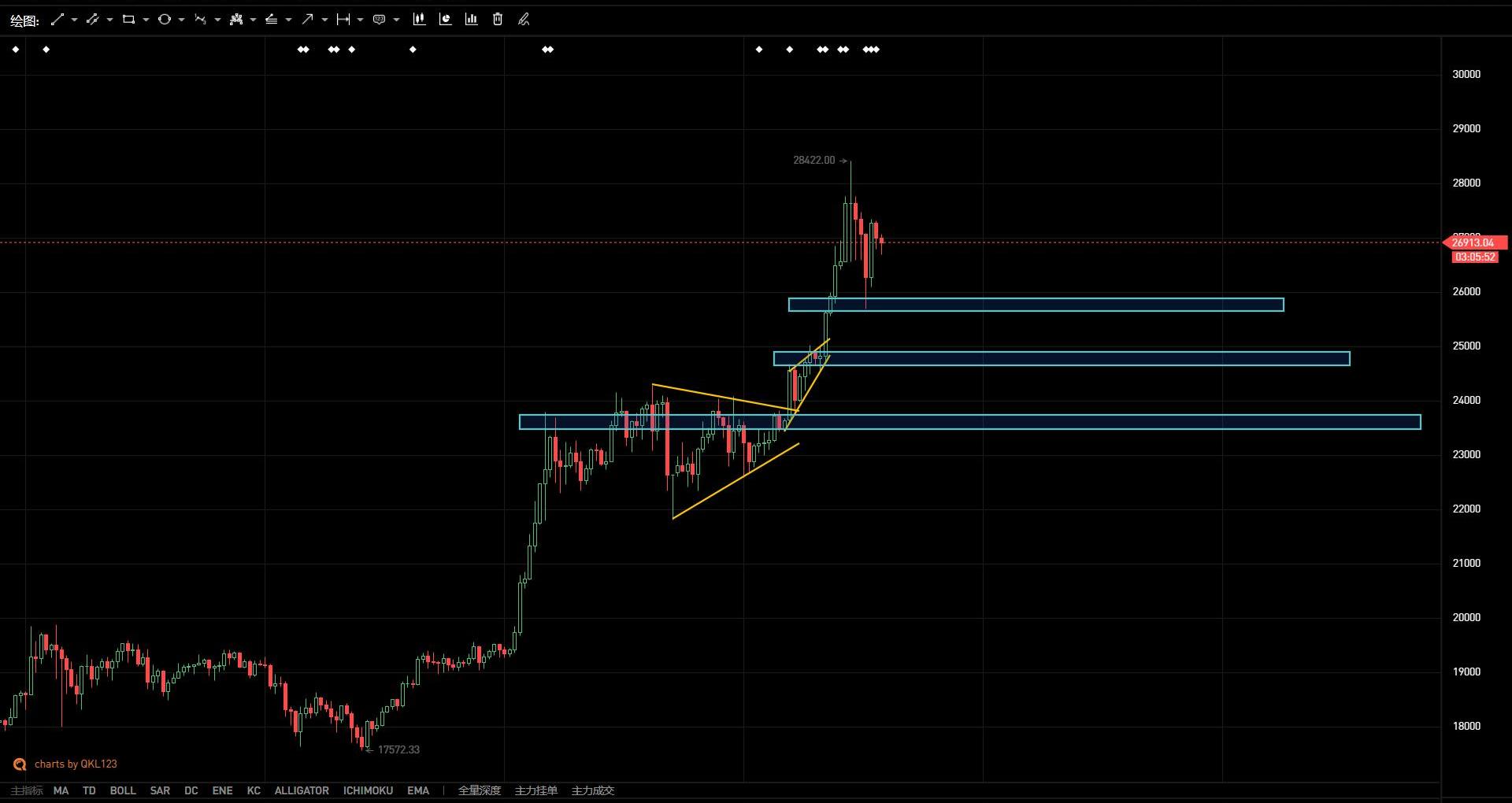 如图所示,比特币在前期三角收敛后接连突破关键位置,随后站稳25000出现加速行情,昨日冲高后凌晨下杀至25700卸杠杆并迅速拉起,随之在25700附近形成短期支撑位,若跌破则关注24700一线,中期支撑重点关注23500附近;早上周线收线形成较长上影线,周内有继续冲高可能,但需提防急速下杀,杠杆率不可过高。