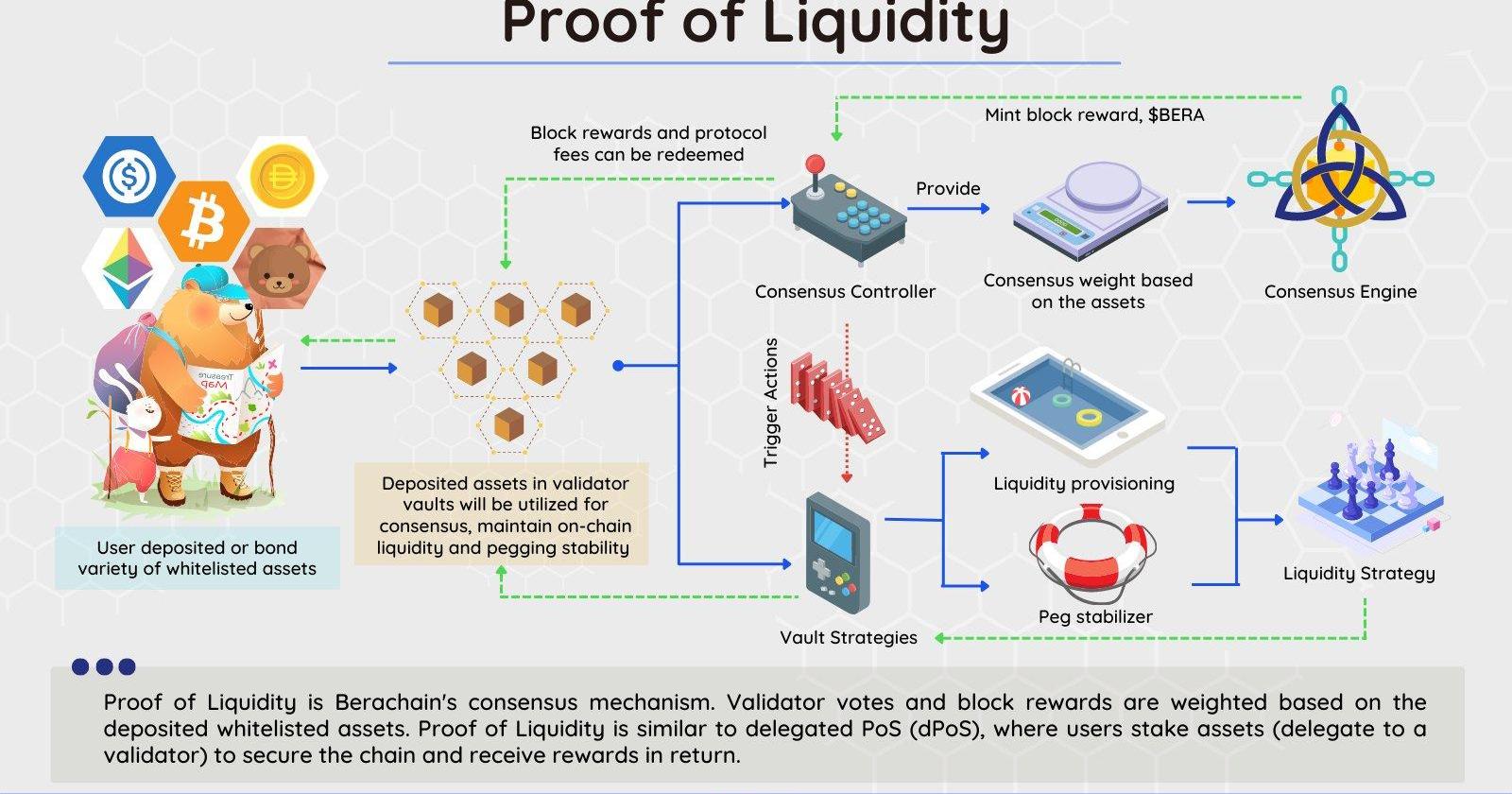 被质押的资产被存放在验证器保险库中。根据治理系统的协调,资产会与$HONEY配对,为Berachain上的官方vAMM、DEX和借贷协议提供流动性。