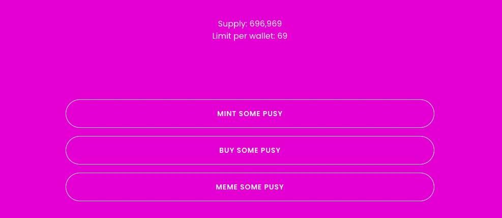 打开?PUSY?代币的官网,其基本信息很少,网站设计的也很简陋,可以看到?PUSY?代币供应量为?696,?969?,每个钱包最大限制是?mint69个?PUSY?代币。此外还有?mint?和购买链接,以及一个?Meme?生成器链接。当前,所有?PUSY?代币均已铸造完毕,仅用?10?个小时,代币持有人有?411?人。但除此之外,官网并未透露更多具体的信息、计划与方案。