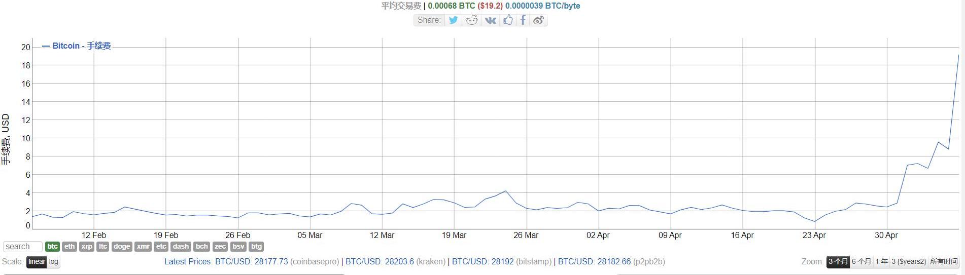 链上数据显示,5月1日开始,BTC每笔平均交易费用开始出现大幅增长,从初期的2U上涨到现在的20U。