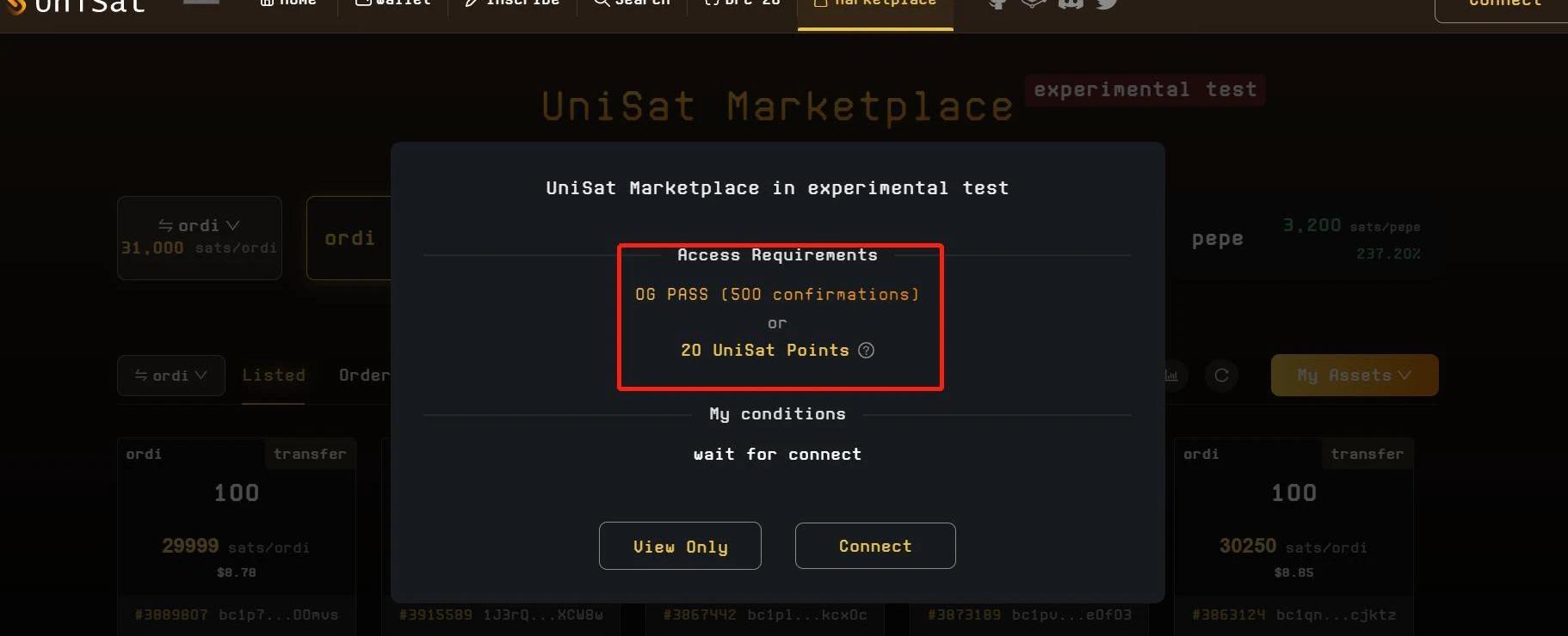 不过,首次使用?Unisat?的交易市场需要门槛,要么是?Unisat?的早期?OG?用户或者有?20Unisat?积分。