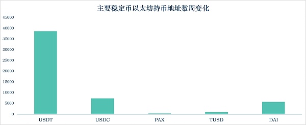 USDT、USDC、PAX、TUSD、DAI的持币地址数分别上升38624个、7331个、269个、885个、5683个。